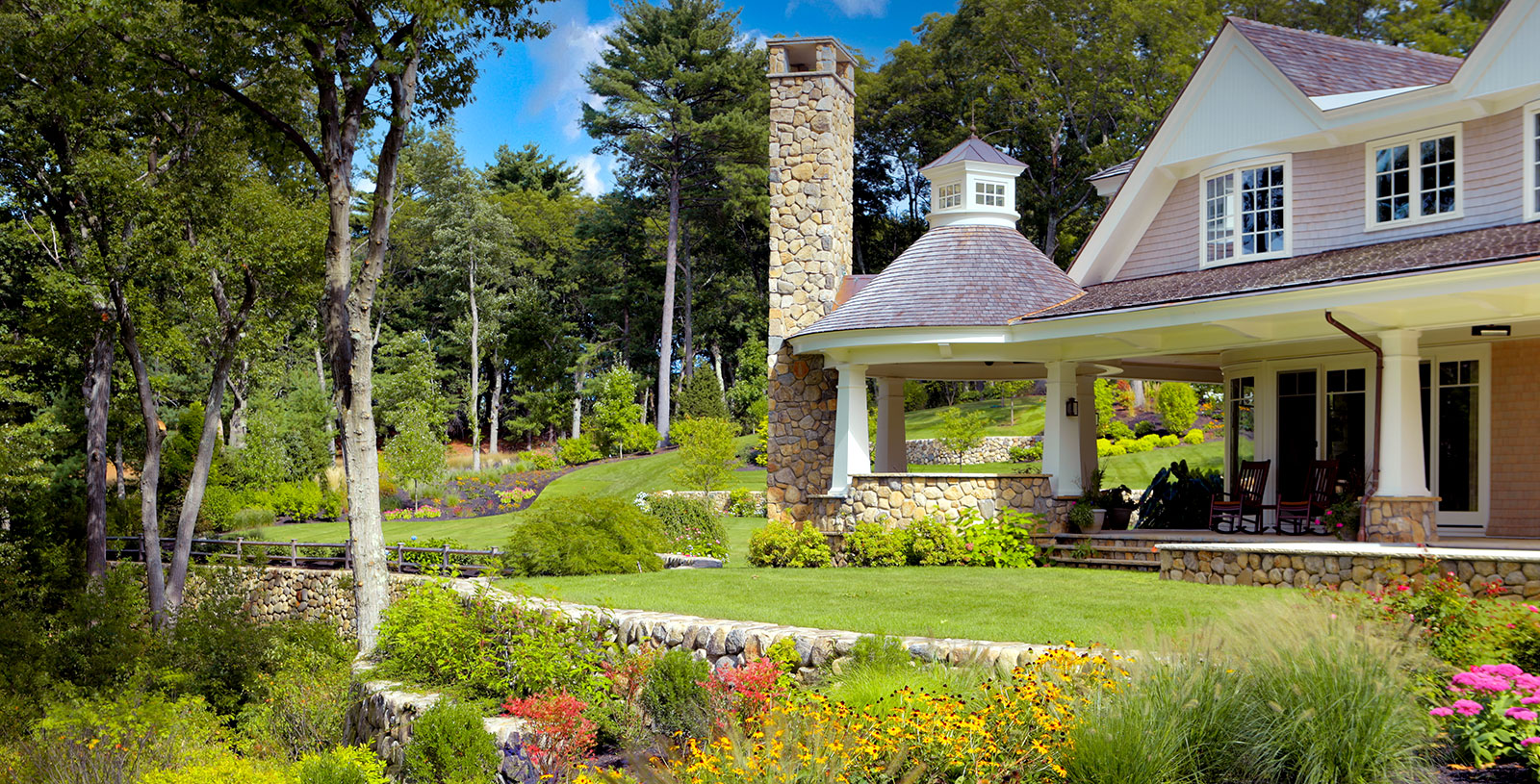 Drawing on the strengths of surrounding bucolic views, the landscape design discernibly reinforces an emotional and physical connection to nature. The main terrace is an alluring extension of the interior living space, providing panoramic views of the surrounding wooded lot and neighboring golf course.