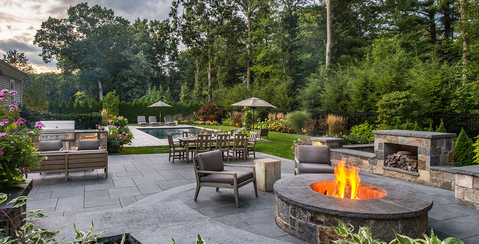 Refined outdoor living areas and experiences are achieved through the integration of meticulously detailed stone masonry, a custom outdoor kitchen, a cozy fire feature, an exquisite inground pool, ornamental plantings and warm lighting.